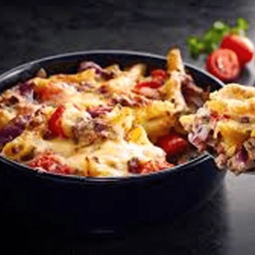 würziges Gyros vom Spieß mit Paprika, Zwiebeln, Champignons, Sahnesauce und mit Gouda überbacken